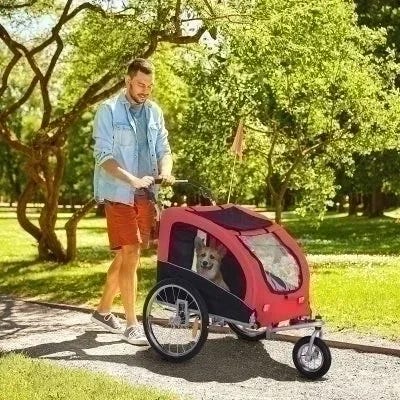 Cykelanhænger til hund som hurtigt og uden brug af værktøj kan laves om til jogger, så man feks. kan cykle ud i skoven og derefter bruge vognen som jogger i skoven.