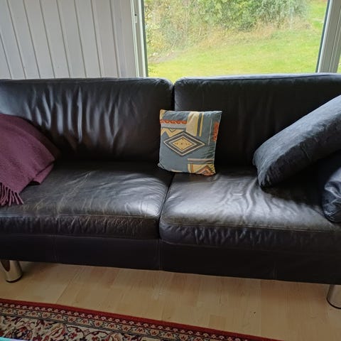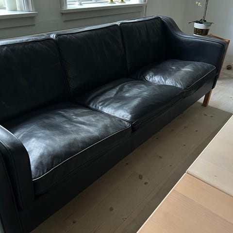 lædersofa , fra ikke ryger hjem , klassisk design, mørkebrun læder , sæbe behandlede egetræs ben , 3 1/2 pers . mål : l:260 cm d: 80 cm h:74cm siddehøjde : 42 cm . Med enkelte brugs spor på kanten af siddehynder.