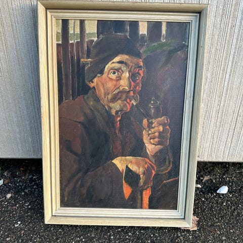 Oliemaleri, OJ, motiv: Portrætter/Figurer, stil: Andet, b: 24 cm h: 30 cm, Fint gammelt maleri af ældre mand med langpibe.
