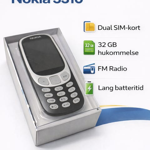 Velholdt nyere Nokia 3310 sælges . Rigtig pæn stand, kun brugt som reserve tlf . Incl oplader mm
