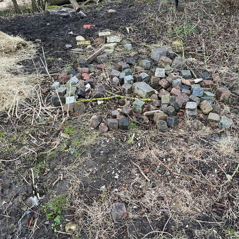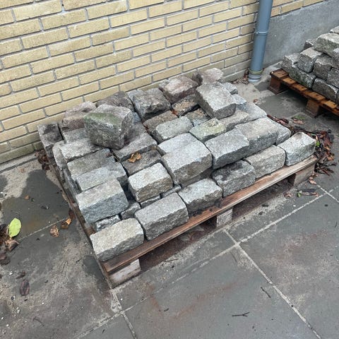 Holmegårdssten til udendørs belægning. Stenene fremstår i blandede nuancer af grå og beige. Formen er primært kvadratisk og diagonal/ kileformet, velegnet til kantafslutninger, buede forløb eller mønsterbelægning. Egnet til fx havegange, terrasser, indkørsler eller kantsten omkring bede og belægninger. Kvadratsten, antal 75 stk, og måler 14x14x7 cm. Diagonalsten, antal 140 stk og måler, 19 cm på det lange stykke, 14 cm på de skrå sider, enderne er 7 cm og tykkelsen er 7 cm. Pris pr. stk.
