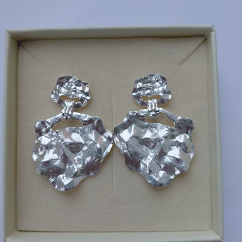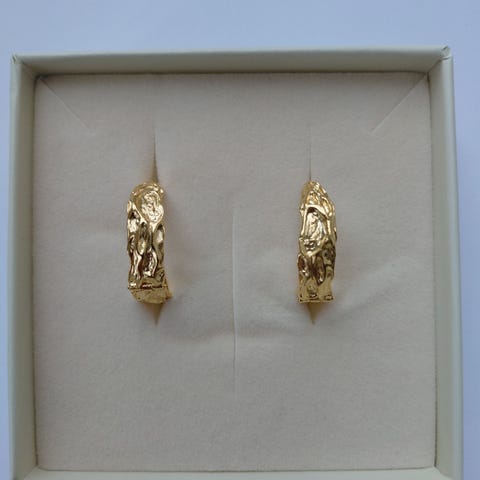 Enamel Copenhagen Windy Large øreringe til kvinde i forgyldt metal. Øreringene har en organisk, hamret overflade og består af en mindre øverste del forbundet med et større vedhæng. De bæres i øret med almindelig stik-lukning. Velegnet som iøjnefaldende smykke til både hverdag og festlige lejligheder. Nypris 1499 kr