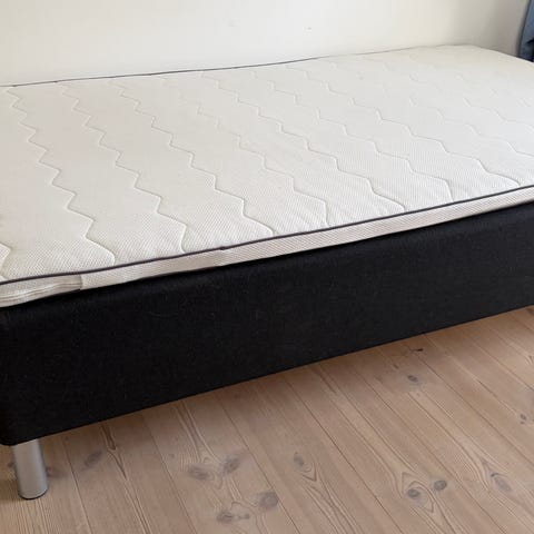 Jysk boxmadras enkeltseng i sort betræk. Sengen står på lyse ben og har en separat topmadras i lyst betræk. Egnet som enkeltseng i soveværelse, gæsteværelse eller ungdomsværelse.