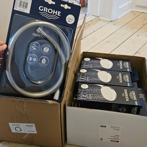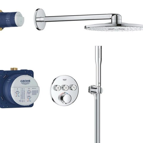 Grohe Tempesta brusesystem 920 mm. Brusesystemet består af en hovedbruser monteret på en lodret stang samt en håndbruser med fleksibel bruseslange og justerbar holder. Systemet er velegnet til montering i bruseniche eller over badekar og giver mulighed for skift mellem hovedbruser og håndbruser efter behov.