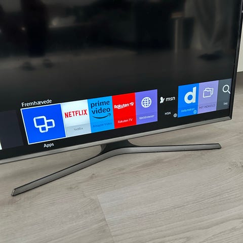 Samsung LED TV i sort. Fladskærms-tv med rektangulær skærm og bordstand. Medfølgende Samsung-fjernbetjening ses på billederne. Yderligere tekniske specifikationer som modelbetegnelse, skærmstørrelse og opløsning fremgår af mærkaten på bagsiden af tv’et og kan bruges til at slå flere detaljer op hos producenten.