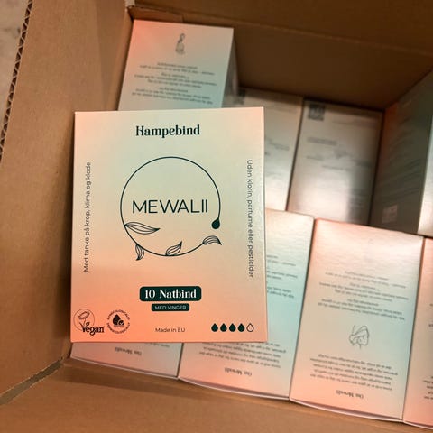 Mewalii hampebind dagbind og natbind med vinger. Pakkerne indeholder bind fremstillet af hampemateriale uden klorin, parfume eller pesticider. Produkterne er veganske og produceret i EU.