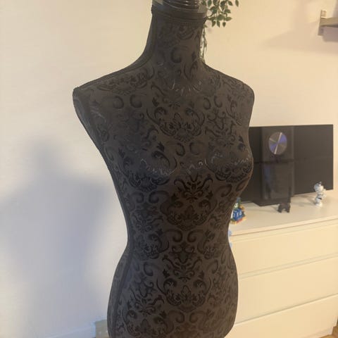 Mannequin dame giner med træfod. Ginen har overkrop i lyst stofmateriale