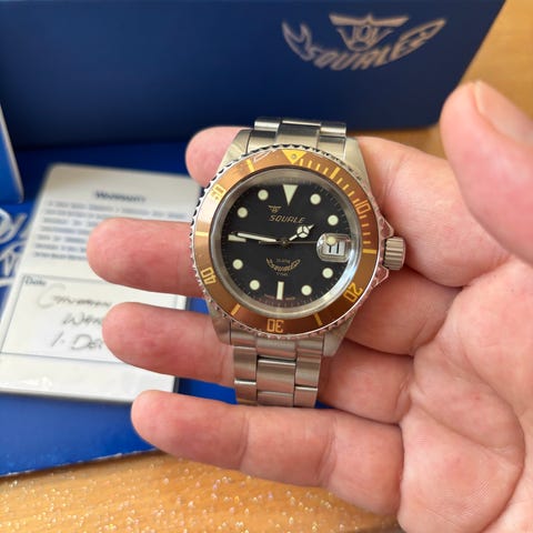 Virkelig flot Squale Atmos 20 1545 i sort. Det kommer som fuldt sæt inkl. Kvittering fra 2022. Overskydende led, boks og tag medfølger også.