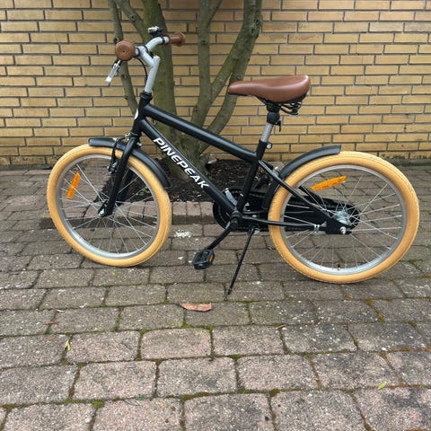 Mustang børnecykel med 18" hjul i flot rød farve. Cyklen har klassisk stel med bagagebærer, kædeskærm og skærme for og bag. Støtteben og reflekser i hjulene. Skal have ny slange i forhjulet.
