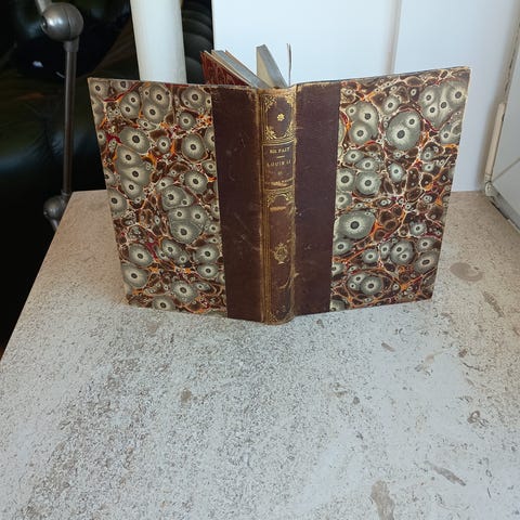 Flot stand (dog en smule bogpatina): Indbundet i grønt gedeskind (helbind) - med blindtrykte spejlrammer på både for- og bagperm - forgyldt titel og forfatternavn og guldbelagte motiver i ryggen - grønt bogmærke af silke - indvendig skindkant og helt fantastisk for- og bagsatspapir - (2.) 280 + (2) sider - tydeligvis en bog som har museums-kvalitet - men mærkeligt nok ikke signeret af denne fremragende bogbinder - 18x12 cm - uden tilskrivninger - Garnier Freres Libraires-Editeurs - uden år (muligvis et genoptryk fra 1875) - men omkring 1880.