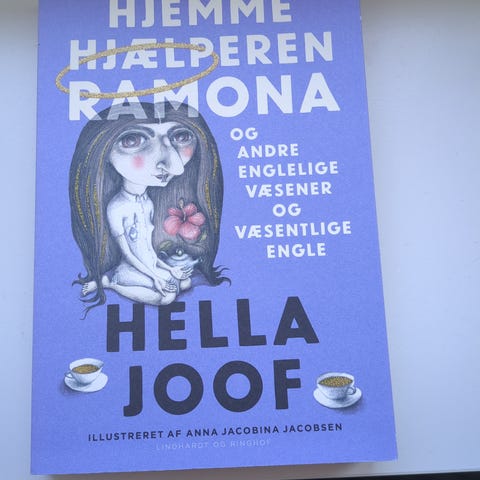 Hella Joof "Hjemmehjælperen Ramona og andre englelige væsener og væsentlige engle" bog. Illustreret af Anna Jacobina Jacobsen. Dansk tekst. Trykt i paperback/softcover-format med farvet omslag. Velegnet til læsere af humoristiske og eftertænksomme fortællinger på dansk.