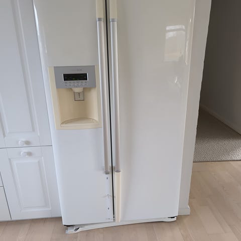Stort amerikaner køleskab. Man skal selv tømme køleskabet for madvarer da det er blevet “efterladt”.
