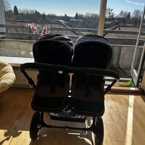Bugaboo tvillingevogn med en liggedel og 2 klapvognssæder i grå tekstil. Vognen har side‑by‑side opbygning med to separate enheder, så ét barn kan ligge i lift, mens det andet sidder i klapvognssædet. Justerbart styr og kalecher over begge pladser. Egnede til transport af to børn på samme tid i hver sin plads. Incl 2 regnslag. Alt er pænt og rent. Nyvasket og i god stand. Alt virker. Stel, hjul, kurven og den ene ramme er nyere, blev skiftet for 2 år siden. ( forsikringsskade) så i rigtig god stand