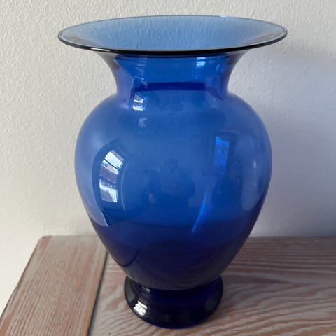 Glasvase ca. 23,5 cm høj og ca. 16,5 i diameter på det bredeste. Det skulle vist være en Holmegård vase. 50 kr.