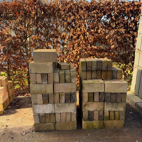 Gamle gule mursten fra 1960’erne til gratis afhentning i Hareskovby. Lidt forskellige stand; Nogle er beskidte med jord andre er lidt ødelagt, men langt de fleste er hele og fine.