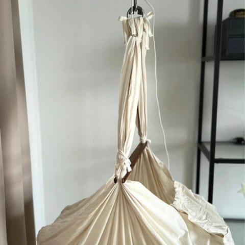 Amazonas Kangoo hængevugge til baby i bomuld i beige og brun. Vuggen hænges op i medfølgende ophæng og har træstang for stabilitet. Stoffet er i kraftig bomuld med indvendige stropper og fastgørelsespunkter. Egnet til ophæng indendørs eller udendørs under tag, fx i loftkrog eller stativ.