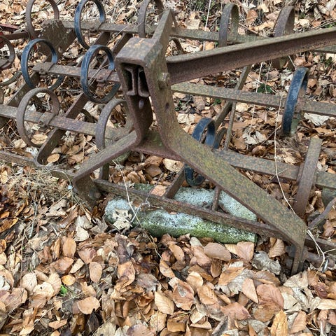 Stubharve til montering på traktor. Redskabet består af en metalramme med flere tænder/arme til bearbejdning af jord, f.eks. til løsning og forberedelse af jord i mark eller have. Velegnet til landbrugs- eller havebrugsmæssige opgaver, hvor der er behov for mekanisk jordbearbejdning med traktor.