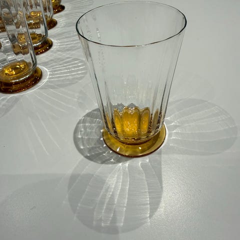 Iittala glas i farvet krystal. Sættet består af tre glas i forskellige farver med slebet mønster og høj stilk. Velegnet som dessertglas, likørglas eller dekorative glas i borddækning eller vitrineskab.