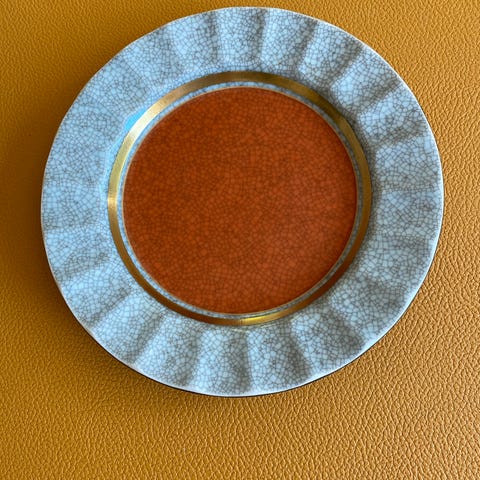 Farvet lysestage, cigaretbæger og Craquelé fad