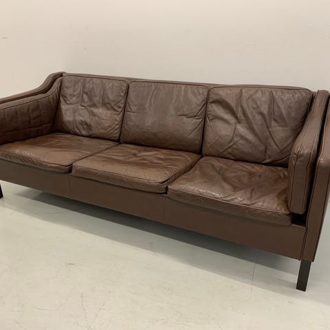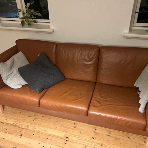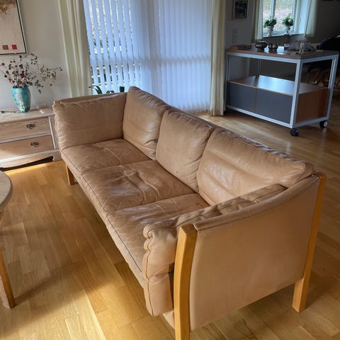 3-personers sofa med sort læderbetræk og lyst træstel. Sofaen har tre separate sæde- og ryghynder i læder og et åbent tremmedesign på ryggen. Egnet som sofa til stue eller opholdsrum, hvor der ønskes en kombination af læder og lyst træ. Fabrikat Brd. Andersen.