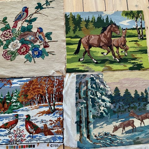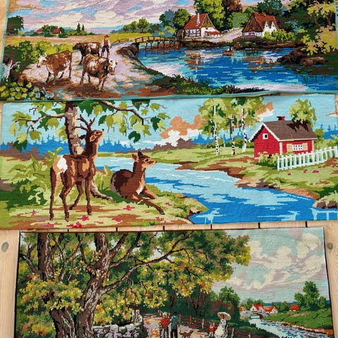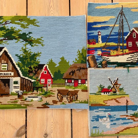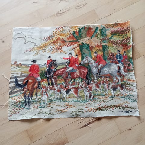 3 Flotte store broderier sælges til 100,-kr pr stk eller samlet 250,-kr billede 1 rytter til hest 54x46 cm billede 2 smukke damer 59x48 cm og billede 3 stort sejlskib 57x42 cm pose 2 #broderier#genbrug#broderiafsejlskib#flottebroderier#broderiafrytter Broderier billedtæpper med tre forskellige motiver: en jagtscene med ryttere til hest og hund, en gruppe damer i historiske kjoler i en have samt et stort sejlskib på havet. Broderierne er udført i farvet garn på stramaj og kan anvendes som vægophæng, puder eller til indramning som dekoration i hjemmet. Velegnet til håndarbejdsprojekter eller som færdige billeder til ophængning.