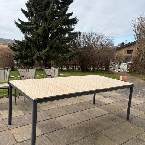 Rundt havebord med tilhørende havestole. Sættet består af et rundt bord med trælameller på bordpladen og metalstel i grøn farve. Til sættet hører flere stole med armlæn, sæde og ryg i trælameller samt metalstel i samme grønne farve. Der medfølger også polstrede hynder i lys farve til stolene. Velegnet til terrasse eller have som udendørs spisesæt.