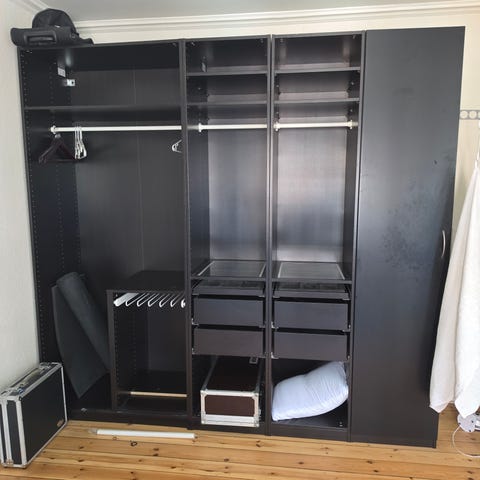 Med bøjlestang og 3 store trådkurve/skuffer og 1 stor hylde. Skabet er pakket sammen og klar til afhentning. Jeg ku ikke finde så mange billeder af det slået op.