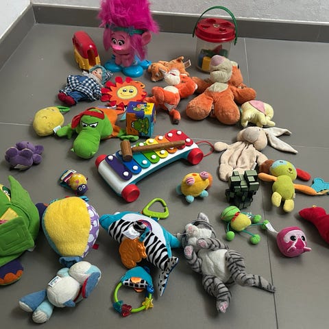 legetøj blandet lot til børn. Samling af forskelligt legetøj til små børn, herunder blødt legetøj, køretøjer, aktivitetslegetøj og sorteringshus. Egnet til leg på gulv og bord, hvor barnet kan øve fin- og grovmotorik, gribefunktion og farve- og formgenkendelse. Flere af delene er bløde og kan bruges af mindre børn under opsyn. Sættet kan anvendes både hjemme og i daginstitution som alsidigt legetøj til hverdagsleg.