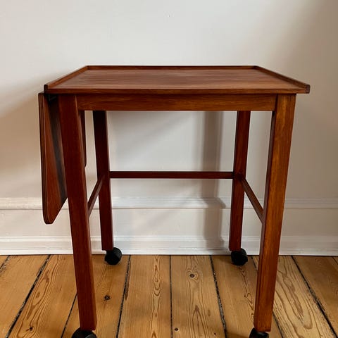 Vintage rullebord i teaktræ. Skuffe under bordpladen og løs hylde forneden. Sort metalstel og hvide gummihjul. Side "vingerne" kan folde op/ned efter behov.