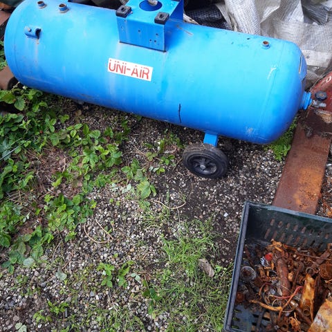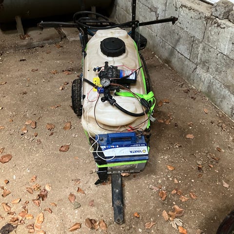 Sprøjtetank på vogn til have- og markbrug. Enheden består af en plasttank monteret på en lille vogn med hjul og trækstang, så den kan trækkes efter et køretøj eller manuelt. På tanken er der monteret pumpe og slanger samt en sprøjtebom/lanse til fordeling af væske.