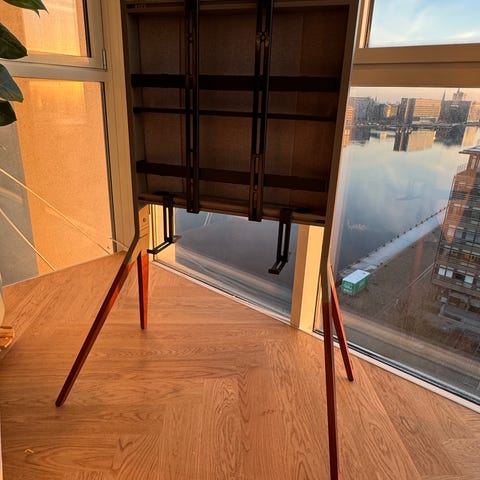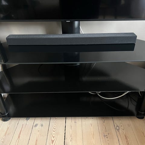 Sælger dette flotte TV-gulvstativ på trefod i sort metal med træ ben. Stativet har en minimalistisk og moderne stil, der passer godt ind i de fleste hjem.