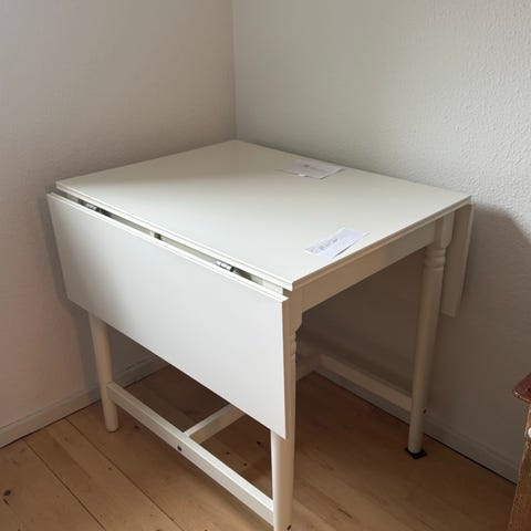 Hvidt bord inkl 3 stole . Der er en plade så under så bordet kan blive større