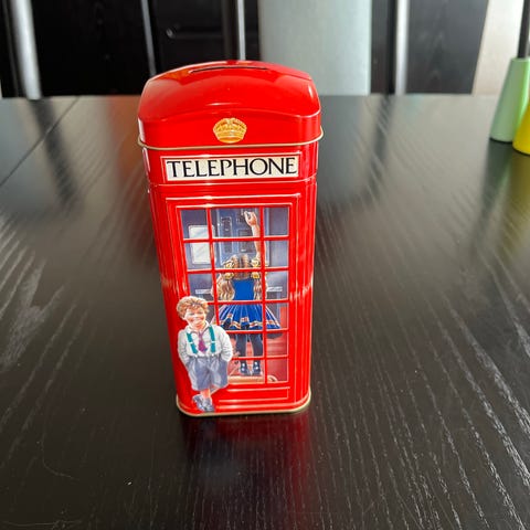 Den klassiske ‘Pengepostkasse’ sparebøsse i rødmalet metal med gule kanter og tryk. Bagsiden er i metal med hul til eventuel ophængning. Sparekassen har flad bund, så den kan stå på en hylde eller et bord. Egnet til opbevaring af mønter og sedler som dekorativ sparebøsse.