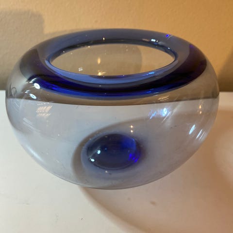 Holmegaard urtepotte med flerfarvet mønster i siderne og i bunden. Skålen har rund form med let udadbøjet kant og lille fod.