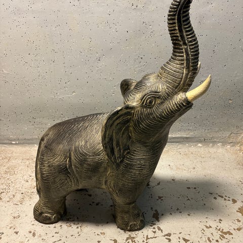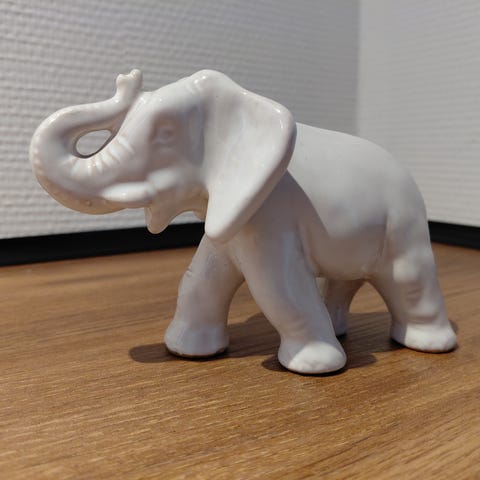 Formentlig en antik keramikfigur formet som en asiatisk elefant med en platform på ryggen, ofte brugt som dekoration eller en lille stand.