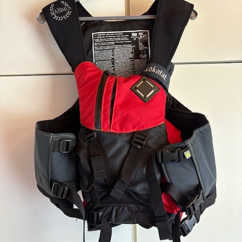 Redningsvest Kokatat Model Poseidon, gul og sort, str. M/L, vægt 58-91 kg. Kr. 1.700,-