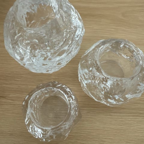 Kosta Boda Snowball lysestager. Sæt med to fyrfadsstager i strukturret glas. De har en lidt røgfarvet skær. Stagerne er kugleformede med ujævn overflade, der giver et spil i lyset fra fyrfadslyset. Egner sig til almindelige fyrfadslys og kan bruges på bord, hylde eller vindueskarm som stemningslys i hjemmet.