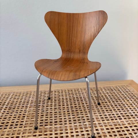 Fritz Hansen, Arne Jacobsen miniature stole sæt bestående af 3 stole i lilla farve. Har stået til pynt i et skab.