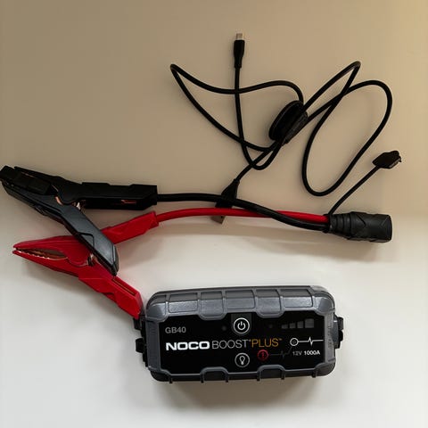 Inferno Jumpstarter JS110, 400A. Enheden har indbygget håndtag, Lys, 12V stik, USB indgangstik, startkabler med kraftige klemmer samt kontrolpanel på fronten med indikatorer og funktionsvælger. Leveres med oplader til genopladning af den interne batteripakke.