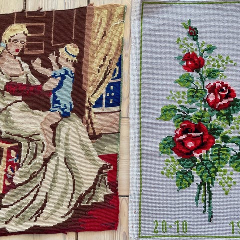 3 små fine broderier sælges samlet 150,-kr billede 1 bondehuse 39x30 cm billede 2 fiskerbåd 21x28 cm billede 3 mølle 36x21 cm, pose 4 billeder med danske landskaber og kystmotiver. Motiverne omfatter blandt andet bondegårdsmiljø, havnemiljø med båd og fyrtårn samt kystlandskab med hus, mølle og dannebrog. Broderierne er udført i farverigt garn på stramaj og egner sig til indramning eller videre brug i fx puder eller vægdekorationer.