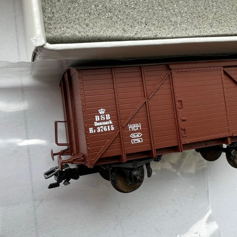 Modeltog DSB sæt med to brunmalede godsvogne og en rød fragtbygning med grønne døre og detaljer. Godsvognene er åbne og lukkede godsvogne egnet til modeljernbane. Fragtbygningen er udformet som en lille stations- eller lagerbygning med tag, døre og trin. Sættet kan anvendes som tilbehør til modelbane og opbygning af godsområde eller station.