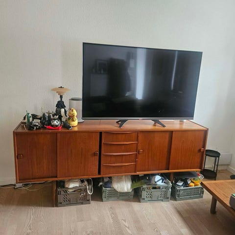 Mega flot skænk i teaktræ med den skønneste ‘glød’, 4 skydelåger, barsektion, bestikskuffer, masser af hyldeplads 🤎.