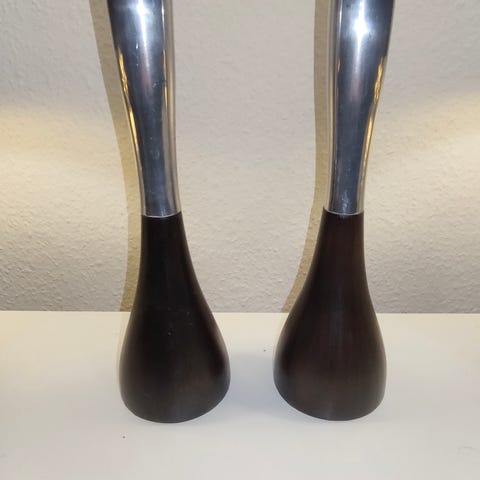 Sælger disse to flotte mini lysestager i rå, ubehandlet aluminium. De har hver deres unikke form og detaljer, hvilket giver et fedt og dynamisk udtryk, når de står sammen som et sæt. Stagerne har en lækker tyngde og et rustikt sølv-look, der passer perfekt til både det moderne og det klassiske hjem. Den er ikke identisk.