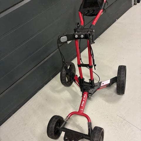 Kadet golfvogn med to hjul i sort. Golfvognen er sammenklappelig for nem opbevaring og transport. Den har håndtag for skub, holder til golfbag samt stor hjulkonstruktion, der giver stabilitet på banen. Velegnet til transport af golfbag og udstyr under runder på golfbanen.