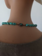 Halskæde, ædelsten, Erik Poul Fenster, Halskæde med turkis sten, der sidder i forløb, trukket på stram silkesnor. Halskædens lås er med et fint filigran mønster med en turkis sten i midten.