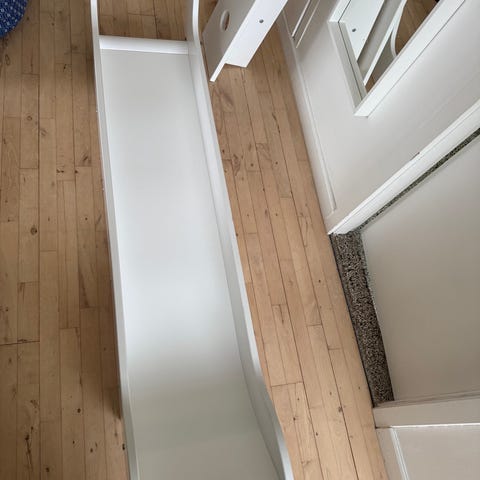 Flexa sengehest til børneseng i hvidmalet træ. Delene fremstår som en træramme/kantstykke, der kan bruges som ekstra modul eller reservedel til en Flexa børneseng. Egnet til montering på eksisterende Flexa sengesystem, for eksempel som støtte- eller sideelement. Farven er lys/hvid, og materialet er træ med synlige samlinger og skruer.
