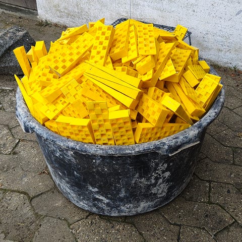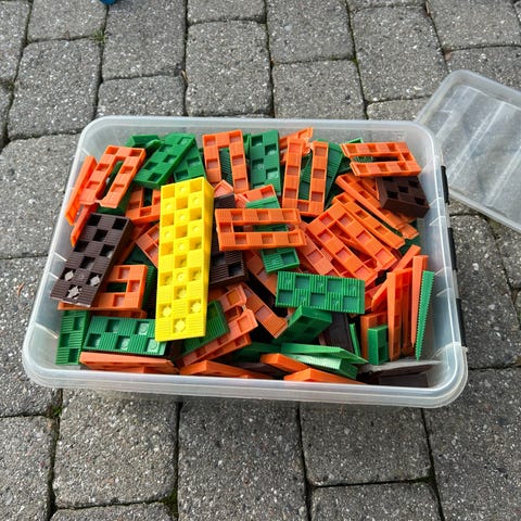 Knudsen Kilen gul afstandskile i plast. Kilerne leveres i en kasse med flere ens gule plastkiler, som kan anvendes til opklodsning og nivellering ved bygge- og monteringsopgaver, f.eks. ved døre, vinduer eller andre konstruktioner, hvor der er behov for præcis afstand og understøtning.