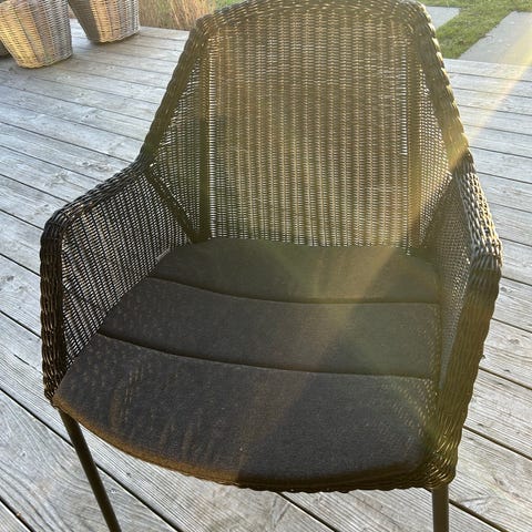 Cane-Line havestol i mørkegrå flet. Stolen har høj ryg og armlæn samt et buet design, der giver støtte i ryggen. Fremstillet i vejrbestandigt fletmateriale egnet til udendørs brug på terrasse, altan eller i have. Stolen står på fire ben og er let at flytte rundt efter behov.