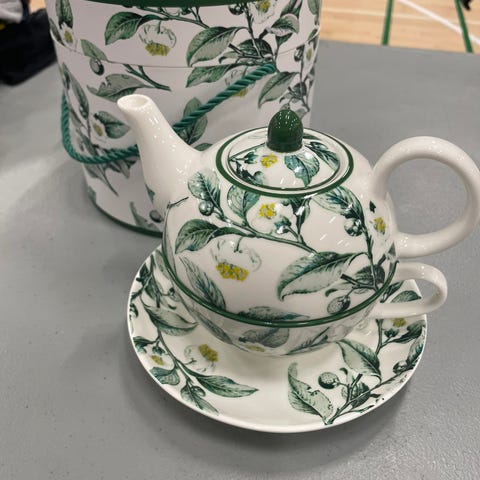 Sjælden gl porcelæn kande tekande 3D med stor fisk, samt 4 små kopper med anemoner og blade som hank SE FOTOS tepotte