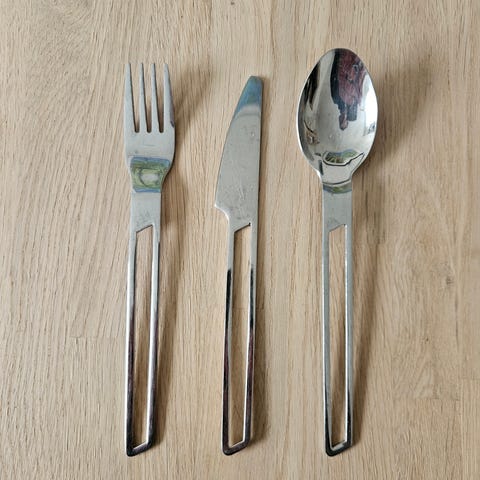 Nordisk titanium bestiksæt med ske, gaffel og kniv. Bestikket er fremstillet i titanium og leveres enkeltvis pakket. Velegnet som let og robust spisegrej til fx camping, vandreture og andre outdoor‑aktiviteter, hvor lav vægt og holdbarhed er vigtig. Designet gør det nemt at opbevare og transportere bestikket i taske eller rygsæk. - flere sæt haves